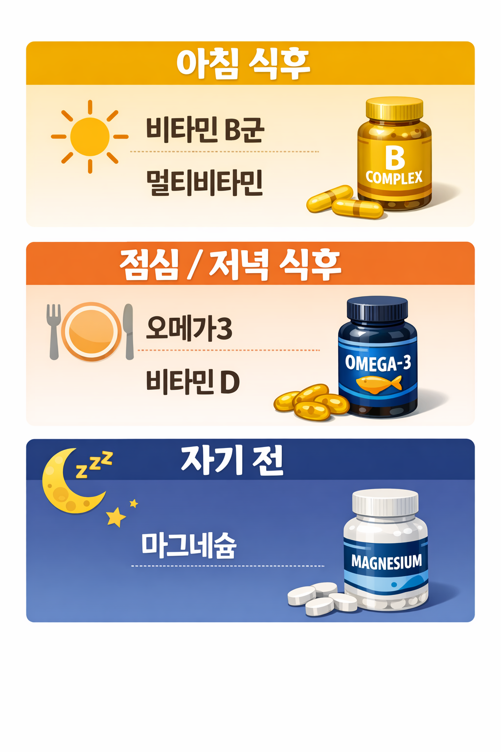 - 점심/저녁 식후: 오메가3, 비타민 D (지방이 있어야 흡수가 잘 됩니다.)